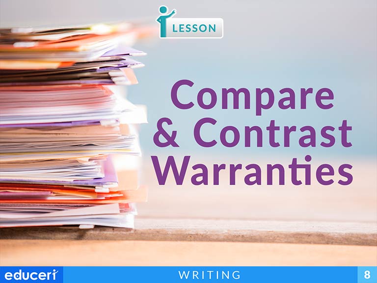 This reading comprehension lesson focuses on comparing and contrasting warranties. The lesson includes research-based strategies and strategic questions that prepare students for assessments. In this lesson, students review a series of questions about a warranty and then scan the warranty to identify the answers and write them in a graphic organizer. Finally, they compare and contrast how two warranties are the same or different. In addition to the lesson, there are five pages of Independent Practice and review along with warranty glossary terms. The questions are modeled on current adaptive testing methods.