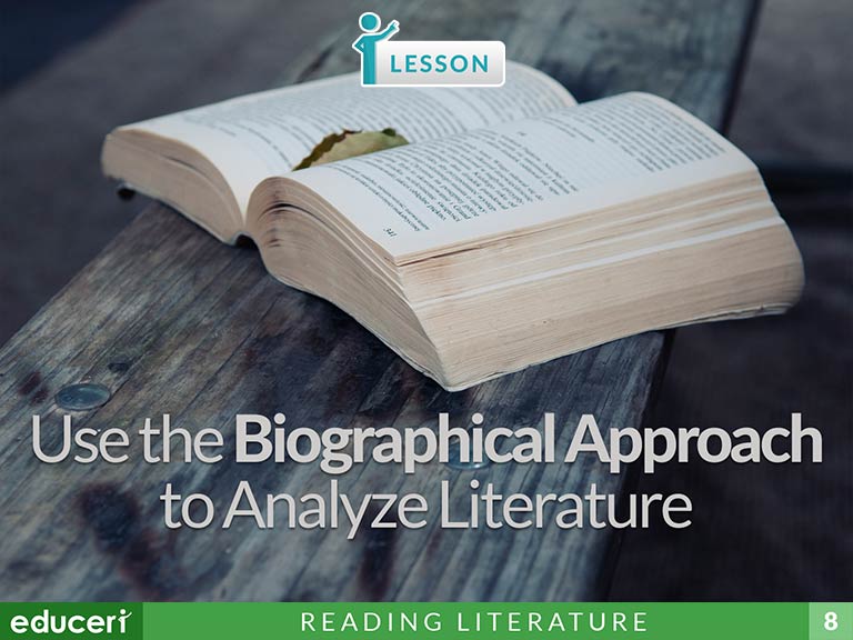 This literary response and analysis lesson focuses on using the biographical approach to analyzing a work of literature. The lesson includes research-based strategies and strategic questions that prepare students for assessments. In this lesson, students read the passage and then underline the sentences that reflect the author's life. Then, they determine whether the biographical reference shows the author's heritage, traditions, beliefs, or attitudes. Finally, they interpret what the author's life was like. In addition to the lesson, there are five pages of Independent Practice and review with questions modeled after current adaptive testing items.