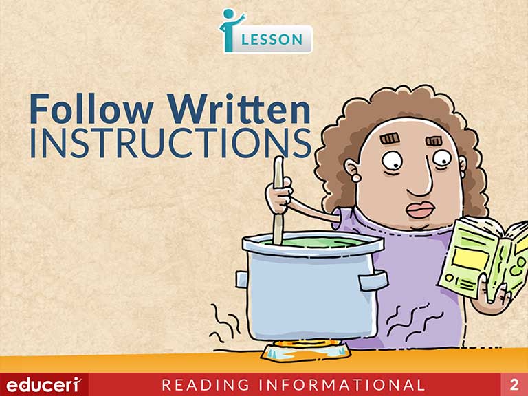 This reading comprehension lesson focuses on how to follow written instructions The lesson includes research-based strategies and strategic questions that prepare students for assessments. In this lesson, students follow steps that tell how to make or do something using steps or clue words such as first, next, then, last, etc. In addition to the lesson, there are five pages of Independent Practice and review with questions modeled after current adaptive testing items.