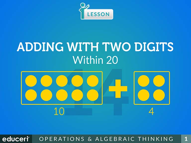 1.OA.6 Add and subtract within 20, demonstrating fluency for addition and subtraction within 10. Use strategies such as counting on; making ten (e.g., 8 + 6 = 8 + 2 + 4 = 10 + 4 = 14); decomposing a number leading to a ten (e.g., 13 - 4 = 13 - 3 - 1 = 10 - 1 = 9); using the relationship between addition and subtraction (e.g., knowing that 8 + 4 = 12, one knows 12 - 8 = 4); and creating equivalent but easier or known sums (e.g., adding 6 + 7 by creating the known equivalent 6 + 6 + 1 = 12 + 1 = 13).