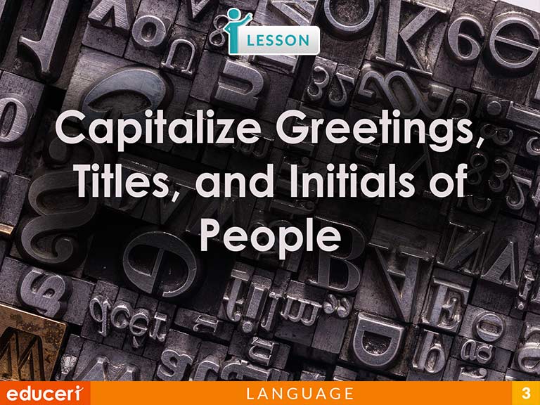 This writing conventions lesson focuses on capitalizing greetings, titles, and initials of people. The lesson includes research-based strategies and strategic questions that prepare students for assessments. In this lesson, students identify words that should be capitalized and select the correct use in a sentence. In addition to the lesson, there are five pages of Independent Practice and review with questions modeled after current adaptive testing items.